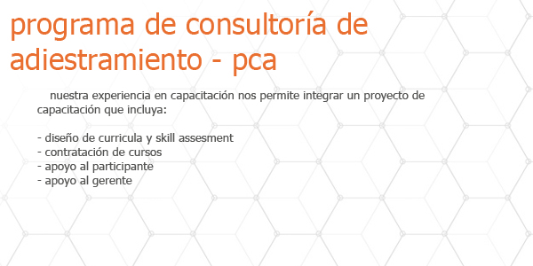 Si necesita un plan de entrenamiento que se adapte de forma precisa a los requerimientos concretos de su empresa, en Enfoque Directo Aplicado contamos con la experiencia necesaria para apoyarlo en la definición de los contenidos pertinentes a su necesidad. Esta planificación de adiestramiento cubre los tópicos correspondientes al logro de sus objetivos, tomando en cuenta los diferentes roles de trabajo indispensables para su consecución. El diseño personalizado de curricula puede llevar incluso a la preparación de talleres de contenidos seleccionados exclusivamente para su adiestramiento. O a planes de capacitación novedosos que toman en cuenta capacitación presencial, remota y on demand. En caso de ser necesaria la aplicación de un Skill Assesment que establezca de manera clara el nivel de conocimiento de los diversos recursos a entrenar, también formaría parte del PCA conforme a la tecnología de cada empresa. A través de nuestro Programa de Consultoría de Adiestramiento usted puede hacer, en línea y sin costo alguno, su solicitud de diseño de curriculas y estaremos gustosos de servirle. Si no es parte de él puede inscribirse ahora mismo.